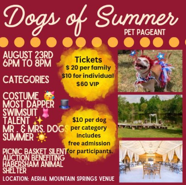 This Saturday, August 23, from 6 to 8 p.m., Aerial Mountain Springs will host the Dogs of Summer Pet Pageant, silent auction, and adoption event. An evening aimed at raising money for Habersham County Animal Care and Control will be held at the lakefront location, which features a large garden and a combination of indoor and outdoor areas.The 2025 Dogs of Summer Pet Pageant will take place at the lakefront location of Aerial Mountain Springs. (Google Photos is the source.)